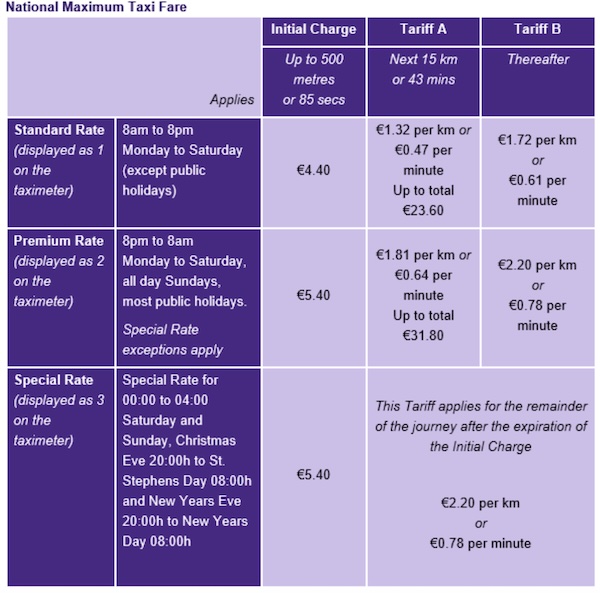 If you get into a taxi from Monday through Saturday in Dublin (8 a.m. to 8 p.m.), an initial charge of €4.40 will be displayed on the meter and will remain so for 85 seconds or up to 0.5 kilometers. Additional charges can be found in the graphic below.