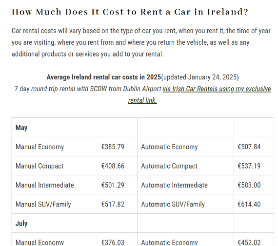 If you’re traveling during peak season (summertime or during major holidays like Christmas), you will undoubtedly pay more. However, if you go to Ireland any other time of year, rates are much lower.